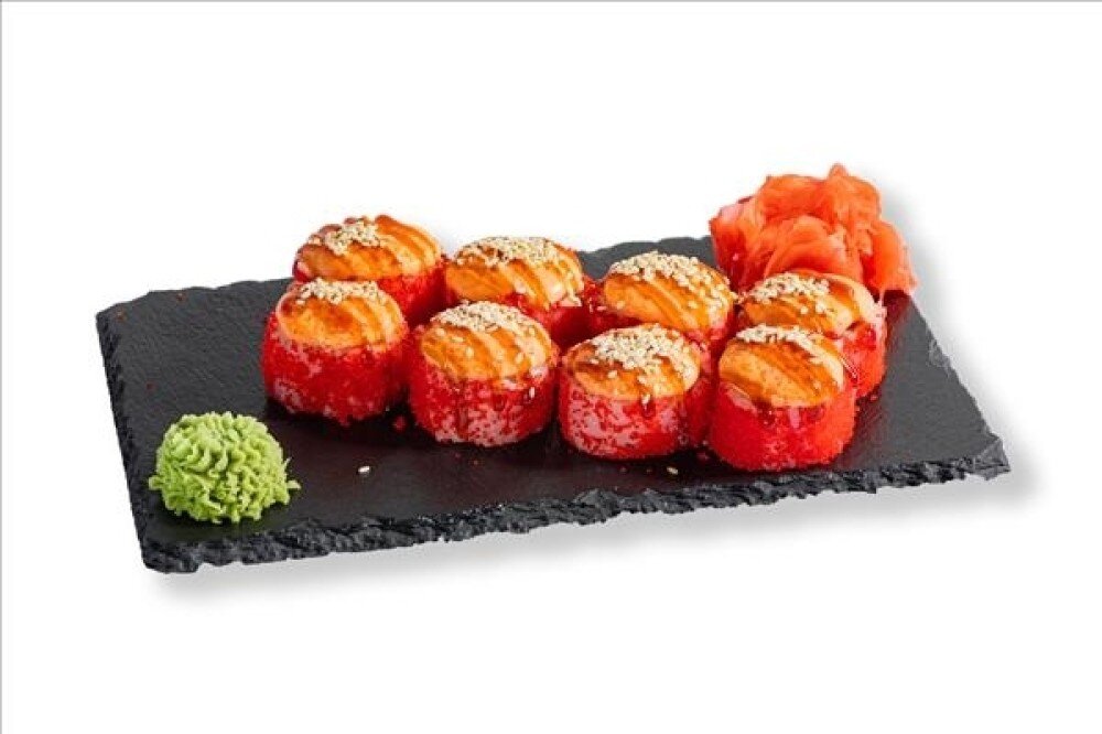 Ролл с сыром креметте, креветкой, икрой летучей рыбы, свежим огурцом, авокадо, запеченный под красным соусом, с соусом унаги. Подается с соусом Кикоман, маринованным имбирем и васаби
