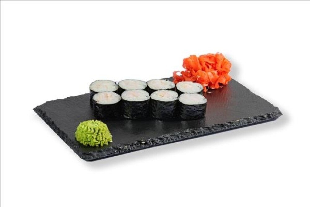 Классический ролл с креветкой. Подается с соусом Кикоман, маринованным имбирем и васаби